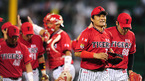 2009 프로야구 정규리그 1,2위 팀인 KIA 타이거즈와 두산 베어스의 경기가 28일 잠실야구장에서 벌어졌다. KIA는 30호 홈런을 친 김상현의 홈런 2방과 최희섭의 스리런 홈런으로 두산에 13-7로 승리 선두를 질주했다. 두 방의 홈런으로 30홈런 고지에 선 김상현이 경기를 마치고 동료들과 덕아웃으로 향하고 있다./잠실=손용호...