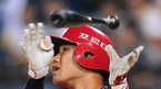 2009 프로야구 정규리그 1,2위 팀인 KIA 타이거즈와 두산 베어스의 경기가 28일 잠실야구장에서 벌어졌다. 3회초 무사 1,2루 김상현이 좌측 담장을 넘어가는 스리런 홈런을 치고 타구를 바라보고 있다. /잠실=손용호 기자spjj@osen.co.kr