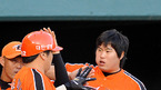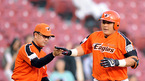 '2009 CJ 마구마구 프로야구' 두산 베어스와 한화 이글스 경기가 2일 잠실 경기장에서 열렸다. 1회초 1사 김태균 좌월솔로 홈런을 날리고 노찬엽 코치의 환영을 받으며 홈인하고 있다./잠실=김영민 기자ajyoung@osen.co.kr