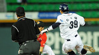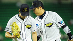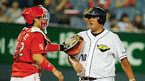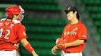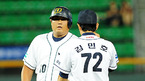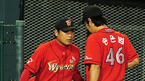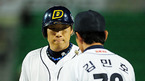'2009 CJ 마구마구 프로야구' 두산 베어스와 SK 와이번스의 경기가 3일 서울 잠실구장에서 벌어졌다. 4회초 2사 주자 만루 SK 정상호 타석에서 두산 선발 금민철이 삼진아웃으로 마무리 하자 덕아웃으로 들어가던 김현수가 금민철의 엉덩이를 때리고 있다./잠실=민경훈 기자 rumi@osen.co.kr