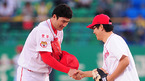 2009 프로야구 1,2위팀인 KIA 타이거즈와 SK 와이번스의 경기가 8일 광주 무등경기장에서 벌어졌다. 개그맨 김용만이 시구에 앞서 선발투수 서재응과 악수를 나누고 있다./광주=손용호 기자spjj@osen.co.kr 온라인으로...