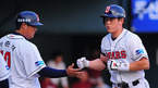 [OSEN=잠실,민경훈 기자] '2010 CJ 마구마구 프로야구' 두산 베어스와 넥센 히어로즈의 경기가 3일 오후 서울 잠실구장에서 열렸다.1회초 1사 주자 2,3루 두산 김동주가 좌월 선취 스리런 홈런을 날린 후 홈에서 선행주자였던 이종욱과 하이파이브를 하고 있다. /
