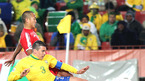 [OSEN/머니투데이=요하네스버그(남아공),손용호 기자] 2010남아공월드컵 북한 대 브라질 경기가 16일(한국시간) 요하네스버그 엘리스 파크 스타디움에서 열렸다.전반 정대세가 브라질 미셸 바스토스의 파울에 넘어지고 있다./ spjj@osen.co.kr