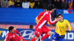 [OSEN/머니투데이=요하네스버그(남아공),손용호 기자] 2010남아공월드컵 북한 대 브라질 경기가 16일(한국시간) 요하네스버그 엘리스 파크 스타디움에서 열렸다.전반 북한의 리준일이 브라질 호비뉴의 공격을 차단하고 있다./ spjj@osen.