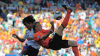 [OSEN/머니투데이=더반(남아공), 송석인 객원기자] 2010 남아공월드컵 일본 대 네덜란드 경기가 19일(한국시간) 더반 모저스 마비다 스타디움에서 열렸다. 전반 네덜란드의 카윗이 일본 나카자와의 마크를 받으며 오버헤드킥을 날리고 있다./&n