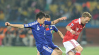 [OSEN/머니투데이=러스텐버그(남아공), 송석인 객원기자] 2010 남아공월드컵 일본 대 텐마크 경기가 25일(한국시간) 새벽 러스텐버그 로열 바포켕 스타디움에서 열렸다. 후반 양팀선수들이 공중볼 다툼을 벌이고 있다./ song@osen.co.kr