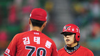 [OSEN=잠실,김영민 기자]'2010 CJ마구마구 프로야구' 두산 베어스 와 KIA 타이거즈 경기가 8일 잠실 구장에서 열려 두산은 김선우를 내세워 '절친' KIA 서재응과의 두 번째 선발 맞대결을 펼친다. 3회말 수비를 마친 KIA 김상훈