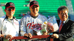 [OSEN=잠실, 민경훈 기자] '2010 CJ마구마구 프로야구' LG 트윈스와 삼성 라이온즈의 경기가 26일 오후 서울 잠실구장에서 열렸다.경기 전 LG 조인성이 한국프로야구 최초 최다타점 달성을 축하하는 행사가 열리고 있다./rumi@osen.co.kr