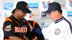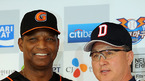 [OSEN=박준형 기자]28일 오후 서울 잠실구장 기자회견장서 열릴 2010 프로야구 준플레이오프 미디어데이 행사 후 롯데 로이스터 감독과 김경문 감독이 인사를 나누고 있다. /soul1014@osen.co.kr