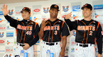 [OSEN=박준형 기자]28일 오후 서울 잠실구장 기자회견장서 열릴 2010 프로야구 준플레이오프 미디어데이 행사 롯데 홍성흔, 로이스터 감독, 조성환, 김현수, 김경문 감독, 손시헌이 포즈를 취하고 있다. /soul1014@osen.co.kr