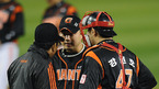 [OSEN=잠실,김영민 기자]29일 잠실 경기장에서 열린 '2010 CJ 마구마구 프로야구 준플레이오프 1차전' 두산 베어스와 롯데 자이언츠 경기 4회말 2사 만루 상황에서 양상문 코치가 선발 송승준과 마운드에서 이야기를 나누고 있다. / ajyoung@osen.co.kr