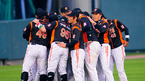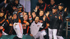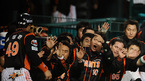 [OSEN=잠실,김영민 기자]29일 잠실 경기장에서 열린 '2010 CJ 마구마구 프로야구 준플레이오프 1차전' 두산 베어스와 롯데 자이언츠 경기 2회초 2사 2,3루 두산 히메네스의 와일드 피칭때 3루 주자 홍성흔 선휘 득점을 올리며 동료들의 환영을 받고 있다.
