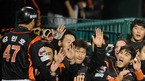 [OSEN=잠실,김영민 기자]29일 잠실 경기장에서 열린 '2010 CJ 마구마구 프로야구 준플레이오프 1차전' 두산 베어스와 롯데 자이언츠 경기 2회초 2사 3루 전준우 적시타때 3루 주자 강민호 득점을 올리며 동료들의 환영을 받고 있다./ ajyoung@osen.co