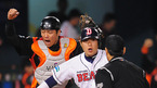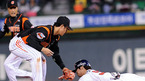 [OSEN=잠실,지형준 기자] 30일 잠실구장에서 열린 '2010 CJ마구마구 프로야구' 준플레이오프 2차전 두산 베어스와 롯데 자이언츠의 경기, 6회말 2사 2루에서 두산 양의지가 손시헌의 좌중간 안타에 홈에서 롯데 강민호에 태그아웃당하고 있다. / jpnews@osen.co.kr