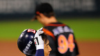 [OSEN=잠실,지형준 기자] 30일 잠실구장에서 열린 '2010 CJ마구마구 프로야구' 준플레이오프 2차전 두산 베어스와 롯데 자이언츠의 경기, 5회말 2사 2루에서 두산 김현수가 내야땅볼로 아웃되며 아쉬워하고 있다. / jpnews@osen.co.kr