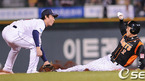 [OSEN=잠실,박준형 기자] 30일 잠실구장에서 열리는 '2010 CJ마구마구 프로야구' 준플레이오프 2차전 두산 베어스와 롯데 자이언츠의 경기에 6회초 1사 1루 롯데 홍성흔의 타석때 1루 주자 조성환이 2루 도루 시도해 태그아웃 되고 있다. / soul1014@osen.co.kr