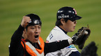[OSEN=잠실,김영민 기자]30일 잠실 경기장에서 열린 '2010 CJ 마구마구 프로야구 준플레이오프 2차전' 두산 베어스와 롯데 자이언츠 경기 가수 김창렬이 경기를 관전하며 환호하고 있다. / ajyoung@osen.co.kr