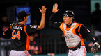[OSEN=잠실,김영민 기자]30일 잠실 경기장에서 열린 '2010 CJ 마구마구 프로야구 준플레이오프 2차전' 두산 베어스와 롯데 자이언츠 경기 6회말 2사 2루 롯데 강민호 포수가 손시헌 좌익수 앞 안타때 2루 주자 양의지 홈까지 쇄도하였으나 아웃처리 시키며 환호하