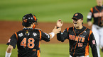 [OSEN=잠실,박준형 기자]30일 잠실 경기장에서 열린 '2010 CJ 마구마구 프로야구 준플레이오프 2차전' 두산 베어스와 롯데 자이언츠 경기 롯데 자이언츠가 연장 10회초 이대호의 스리런 홈런에 힘입어 4-1 승리를 거두며 플레이오프 진출 1승을 남겨두었다.&nbs