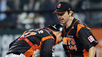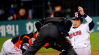 [OSEN=잠실,박준형 기자] 30일 잠실구장에서 열리는 '2010 CJ마구마구 프로야구' 준플레이오프 2차전 두산 베어스와 롯데 자이언츠의 경기에 6회말 2사 2루 두산 손시헌의 외야안타때 2루 주자 양의지가 홈에서 태그아웃됐다. 실점을 저지한 롯데 사도스키가 박수