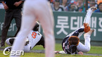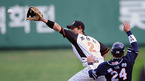 [OSEN=부산,김영민 기자]3일 부산 사직 경기장에서 열린 '2010 CJ 마구마구 프로야구 준플레이오프 4차전' 두산 베어스와 롯데 자이언츠 경기 7회말 1사 1,2루 강민호 타석때 1루 주자 전준우 1루 귀루아웃 처리되고 있다./ ajyoung@osen.co.kr