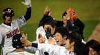 [OSEN=잠실,김영민 기자]5일 잠실 경기장에서 열린 '2010 CJ 마구마구 프로야구 준플레이오프 5차전' 두산 베어스와 롯데 자이언츠 경기 2회말 1사 1,2루 용덕한 선취 2타점 적시타때 2루 주자 임채철 득점을 올리며 동료들의 환영을 받고 있다./ ajyoung@osen.co.kr