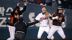 [OSEN=잠실,김영민 기자]5일 잠실 경기장에서 열린 '2010 CJ 마구마구 프로야구 준플레이오프 5차전' 두산 베어스와 롯데 자이언츠 경기 3회초 2사 만루 조성환 타석때 3루 주자 황재균 두산 김선우 투수의 와일드 피칭때 홈까지 파고들어 득점을 올리고 있다./ a