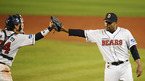 [OSEN=잠실,김영민 기자]5일 잠실 경기장에서 열린 '2010 CJ 마구마구 프로야구 준플레이오프 5차전' 두산 베어스와 롯데 자이언츠 경기 8회초 2사 왈론드 마운드를 정재훈에게 넘기며 용덕한 포수와 하이파이브를 하고 있다./ ajyoung@osen.co.kr