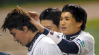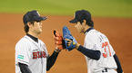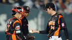 [OSEN=잠실,박준형 기자] 5일 잠실구장에서 열린 '2010 CJ마구마구 프로야구' 준플레이오프 5차전 두산 베어스와 롯데 자이언츠의 경기 6회말 롯데 조성환에게 1타점 적시타를 허용한 두산 선발 김선우가 교체되며 고창성과 하이파이브를 하고 있다.&n