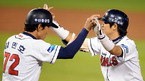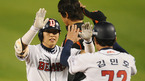 [OSEN=잠실,박준형 기자] 5일 잠실구장에서 열린 '2010 CJ마구마구 프로야구' 준플레이오프 5차전 두산 베어스와 롯데 자이언츠의 경기 5회말 2사 3루 두산 정수빈의 1타점 적시타때 3루 주자 용덕한이 홈을 밟은 뒤 이종욱의 격한(
