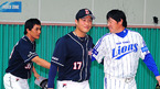 [OSEN=대구,지형준 기자] 6일 오후 대구시민운동장 실내체육관 기자회견장에서 열린 2010 프로야구 플레이오프 미디어데이를 마치고 삼성 진갑용이 두산 이종욱, 임재철과 인사를 나누고 있다. 2년 만에 플레이오프에서 리턴매치를 벌이는