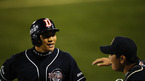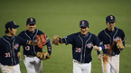 [OSEN=대구,김영민 기자]7일 대구 경기장에서 열린 '2010 CJ 마구마구 프로야구 플레이오프 1차전' 삼성 라이온즈와 두산 베어스 경기 5회말 1사 2루 박석민 중견수 플라이때 두산 이종욱 중견수 포구하며 2루 주자 조동찬 까지 아웃처리 시키며 팀 동료들의 환영