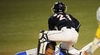 [OSEN=대구,김영민 기자]7일 대구 경기장에서 열린 '2010 CJ 마구마구 프로야구 플레이오프 1차전' 삼성 라이온즈와 두산 베어스 경기 3회말 2사 1,2루 최형우 적시타때 2루 주자 채태인 홈까지 쇄도하였으나 두산 용덕한 포수가 태그아웃 처리