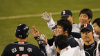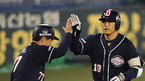 [OSEN=대구,김영민 기자]7일 대구 경기장에서 열린 '2010 CJ 마구마구 프로야구 플레이오프 1차전' 삼성 라이온즈와 두산 베어스 경기 4회초 무사 1루 김동주 좌월 동점 투런 홈런을 날리고 홈인 덕아웃 동료들의 환영을 받고 있다./ ajyoung@osen.co.kr