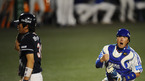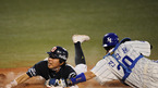 [OSEN=대구,김영민 기자]7일 대구 경기장에서 열린 '2010 CJ 마구마구 프로야구 플레이오프 1차전' 삼성 라이온즈와 두산 베어스 경기 3회말 2사 1,2루 최형우 적시타때 2루 주자 채태인 홈까지 쇄도하였으나 두산 용덕한 포수에게 태그아웃 처