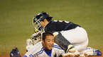 [OSEN=대구,김영민 기자]7일 대구 경기장에서 열린 '2010 CJ 마구마구 프로야구 플레이오프 1차전' 삼성 라이온즈와 두산 베어스 경기 1회초 1사 2,3루 삼성 진갑용 포수가 최준석의 플라이 때 태그업한 3루 주자 정수빈을 홈에서 태그아웃 처리시키며