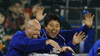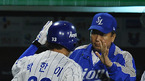 [OSEN=대구,김영민 기자]7일 대구 경기장에서 열린 '2010 CJ 마구마구 프로야구 플레이오프 1차전' 삼성 라이온즈와 두산 베어스 경기 8회말 2사 1,2루 박한이 역전 스리런 홈런을 날리고 홈인 선동렬 감독의 환영을 받고 있다./ ajyoung@osen.co.kr