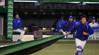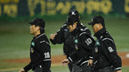 [OSEN=대구,김영민 기자]8일 대구 경기장에서 열린 '2010 CJ 마구마구 프로야구 플레이오프 2차전' 삼성 라이온즈와 두산 베어스 경기 2회초 두산 공격때 우천으로 경기가 중단되며 심판들이 철수하고 있다./ ajyoung@osen.co.kr