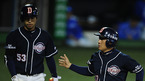 [OSEN=대구,김영민 기자]8일 대구 경기장에서 열린 '2010 CJ 마구마구 프로야구 플레이오프 2차전' 삼성 라이온즈와 두산 베어스 경기 3회초 1사 2,3루 정수빈 희생플라이때 3루 주자 손시헌 태그업 선취득점을 올리고 있다./ ajyoung@osen.co.kr