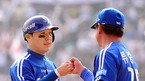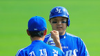 [OSEN=잠실,김영민 기자]10일 잠실 경기장에서 열린 '2010 CJ 마구마구 프로야구 플레이오프 3차전' 삼성 라이온즈와 두산 베어스 경기 1회초 1사 만루 채태인 1타점 적시타를 날리고 1루 김재걸 코치의 환영을 받고 있다./ ajyoung@osen.co.kr
