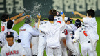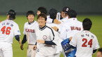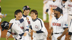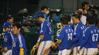 [OSEN=잠실,김영민 기자]10일 잠실 경기장에서 열린 '2010 CJ 마구마구 프로야구 플레이오프 3차전' 삼성 라이온즈와 두산 베어스 경기 두산이 연장 11회말 손시헌의 끝내기 안타로 3차전 승리를 거두었다. 경기 종료후 선수들이 승리의