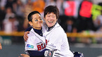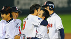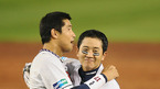 [OSEN=잠실,김영민 기자]10일 잠실 경기장에서 열린 '2010 CJ 마구마구 프로야구 플레이오프 3차전' 삼성 라이온즈와 두산 베어스 경기 두산이 연장 11회말 손시헌의 끝내기 안타로 3차전 승리를 거두었다. 경기 종료후 김현수가 임재철