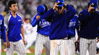 [OSEN=잠실,김영민 기자]10일 잠실 경기장에서 열린 '2010 CJ 마구마구 프로야구 플레이오프 3차전' 삼성 라이온즈와 두산 베어스 경기 두산이 연장 11회말 손시헌의 끝내기 안타로 3차전 승리를 거두었다. 경기 종료후 삼성 선수들이 덕