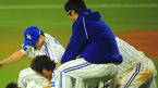 [OSEN=대구,지형준 기자] 13일 대구구장에서 열린 '2010 CJ마구마구 프로야구' 플레이오프 5차전 경기, 11회말 2사 만루에서 두산 임태훈이 삼성 박석민에 끝내기 안타를 허용하고 주저앉고 있다. / jpnews@osen.co.kr