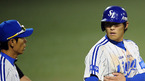 [OSEN=대구,김영민 기자]13일 잠실 경기장에서 열린 '2010 CJ 마구마구 프로야구 플레이오프 5차전' 삼성 라이온즈와 두산 베어스 경기 8회말 2사 이영욱 몸에 맞는 볼로 진루하며 맞은 부위를 매만지면서 김재걸 코치와 이야기를 나누고 있다./ ajyo