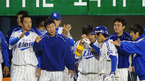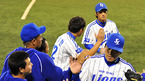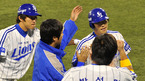 [OSEN=대구,김영민 기자]13일 잠실 경기장에서 열린 '2010 CJ 마구마구 프로야구 플레이오프 5차전' 삼성 라이온즈와 두산 베어스 경기 5회초 무실점 수비를 마친 정현욱이 덕아웃 동료들로 부터 축하를 받고 있다./ ajyoung@osen.co.kr