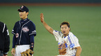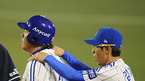 [OSEN=대구,김영민 기자]13일 잠실 경기장에서 열린 '2010 CJ 마구마구 프로야구 플레이오프 5차전' 삼성 라이온즈와 두산 베어스 경기 6회말 선두타자 진갑용 내야안타 진루후 김재걸 코치의 환영을 받고 있다./ ajyoung@osen.co.kr