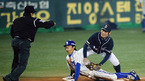 [OSEN=대구,지형준 기자] 13일 대구구장에서 열린 '2010 CJ마구마구 프로야구' 플레이오프 5차전 경기, 7회초 1사 1루에서 삼성 장원삼의 폭투에 두산 고영민이 삼성 김상수의 태그를 피해 2루 도루에 성공하고 있다. / jpnews@osen.co.kr