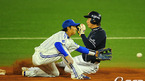 [OSEN=대구,김영민 기자]13일 잠실 경기장에서 열린 '2010 CJ 마구마구 프로야구 플레이오프 5차전' 삼성 라이온즈와 두산 베어스 경기 6회말 무사 1루 이영욱 좌익수 키를 넘기는 동점 적시타를 날리고 3루까지 뛰었으나 태그아웃 처리되고 있