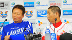 [OSEN=문학,지형준 기자] 14일 오후 인천 문학월드컵컨벤션센터 미추홀에서 열린 2010 프로야구 한국시리즈 미디어데이에서 삼성 선동렬 감독이 옆구리 통증을 호소하자 SK 김성근 감독이 바라보고 있다. 7년만에 포스트시즌에서 만나 사상 처음 한국시